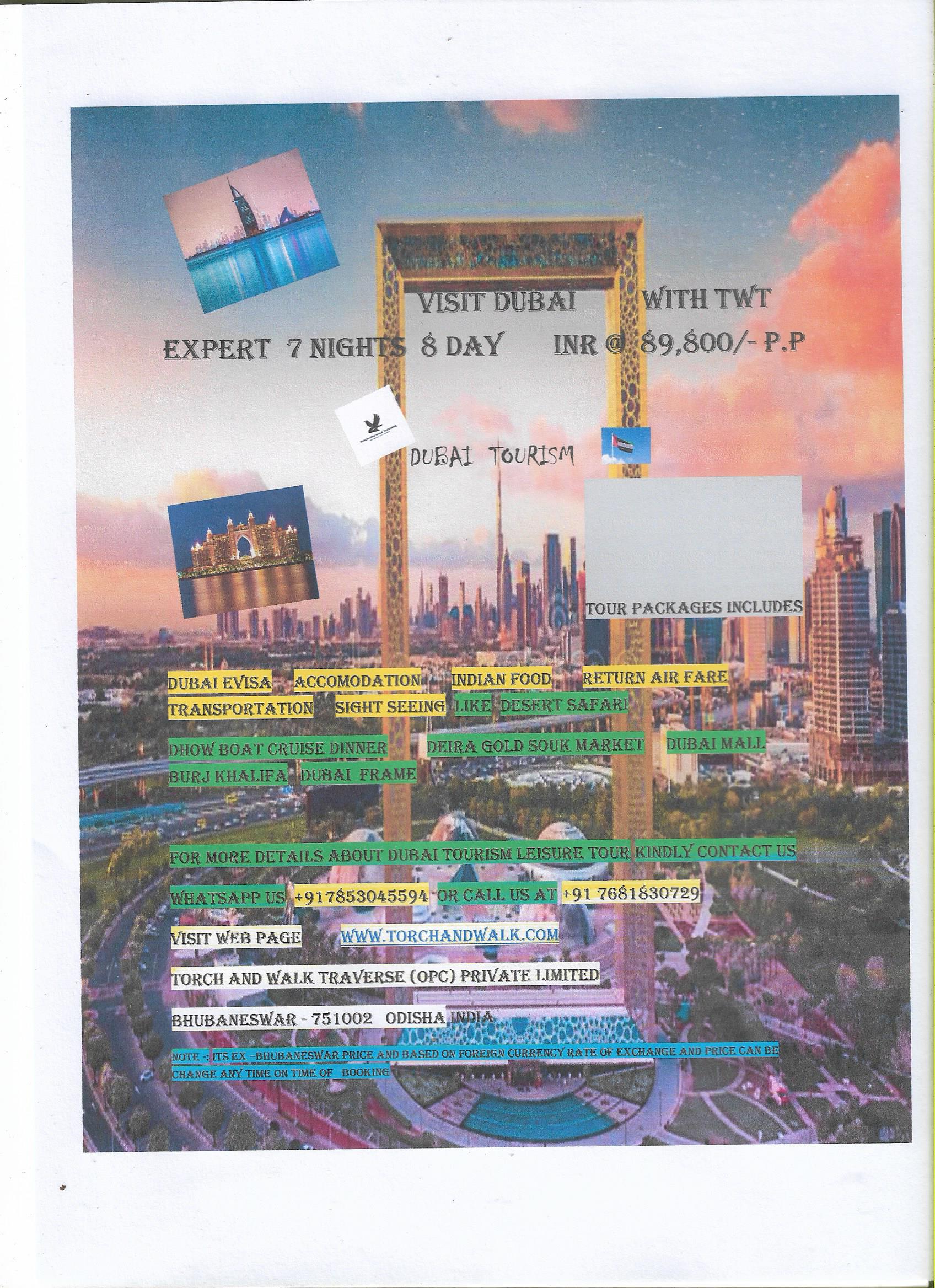 DUBAI TOURISM VISIT 7 NIGHTS 8 DAYS DUBAI @ INR 89,800/-PER PAX EXPLORE DUBAI TOURISM Share this:Tweet Click to print (Opens in new window) Print Click to email a link to a friend (Opens in new window) Email Click to share on WhatsApp (Opens in new window) WhatsApp